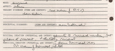 The "Initial Evaluation Sheet" completed in the psych ER classifies the author as potentially suicidal. |