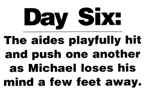 The nurse starts making phone calls for a restraint. Soon, about five young men--therapy aides from other units--appear on the floor. As the aides converge they greet each other, horseplaying, playfully hitting and pushing one another, joshing and joking, loudly laughing and guffawing, giving one another high fives, while Michael loses his mind a few feet away.