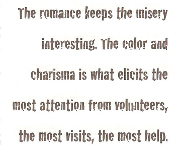 As time goes on, you become less and less afraid of the people you're dealing with, deluding yourself with the fantasy that your past good works are universally acknowledged. And you become more confident that you've earned the right to interfere in their lives without apology. But you also develop that much touted goal of Social Work 101: you start seeing the homeless as individuals. One result, however, is that as individuals the people you meet are no longer protected by the canonical label of "homeless," and you become less democratic in your charity.