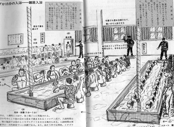 An inmate bathing room. The heavily tattooed inmates are members of the Yakuza, the Japanese Mafia.
