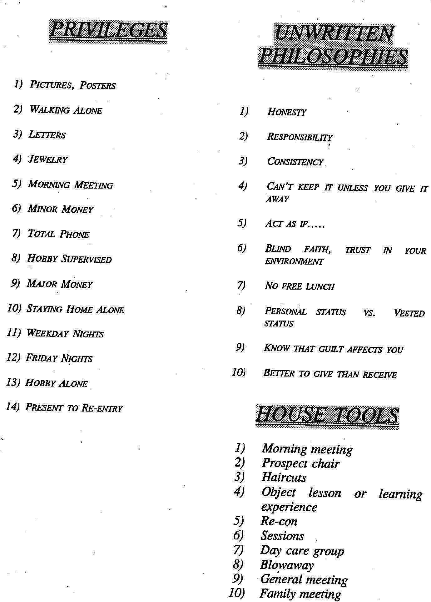 Like at many TCs there are no more Blowaways, stocking caps, no more scrubbing on your knees. There are still signs but you don’t have to wear them. The Chair is a desk they sit on for a day. They have to earn points for privileges like using the phone. They still clean and read their guilt to the Family.
